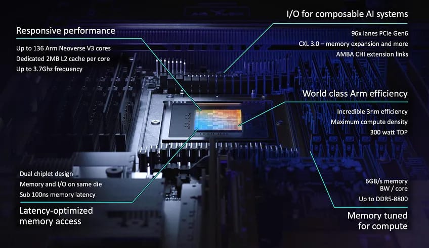 The AGI CPU itself is a serious piece of engineering. Up to 136 Neoverse V3 cores per chip, 300 watts of thermal headroom, PCIe Gen 6 connectivity, and CXL 3 memory expansion. Arm claims more than 2x the performance per rack compared to incumbent x86 platforms, a number that, if it holds up in production, could shift how hyperscalers think about density and cooling.