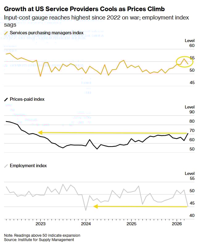 Employment fell 6.6 points to 45.2, dropping into contraction for the first time in four months. Five industries reported hiring, six reported cuts. The committee chair called it a surprise, which is not language you usually see in these reports. For a services sector that had been holding up the broader labor picture, it is a number worth paying attention to.