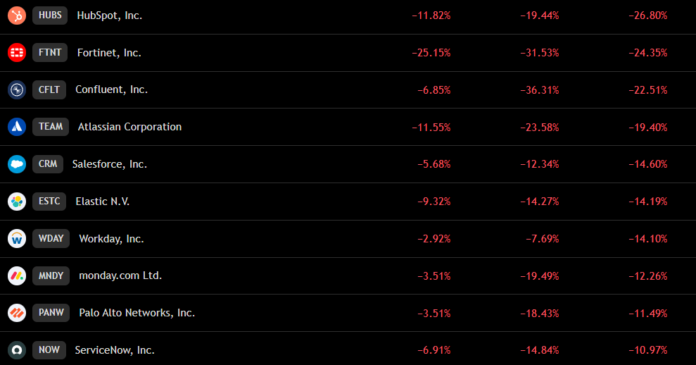 HUBS, FTNT, CFLT, TEAM, CRM, ESTC, WDAY, MNDY, PANW, NOW